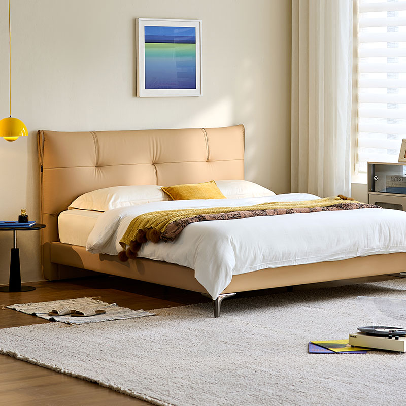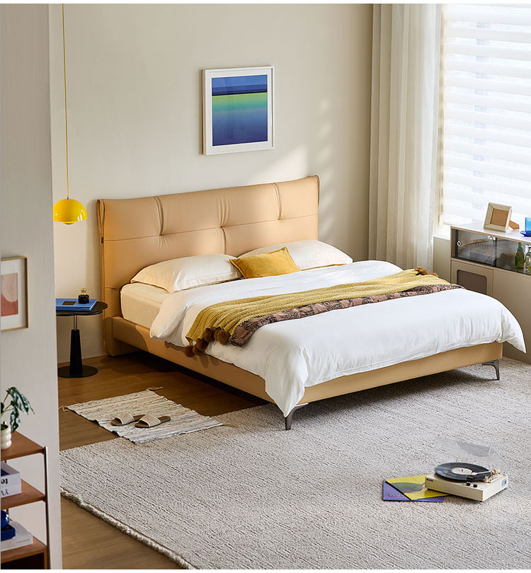 מודרניות נצחית: עם הקווים הנקיים והריפוד המרקמי שלה, מיטה זו משמשת כמרכז מרכזי מדהים.