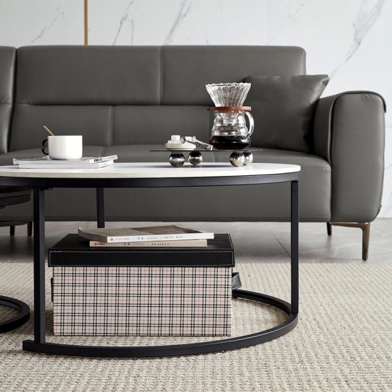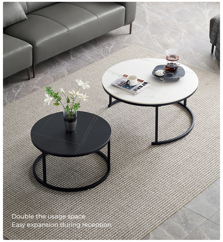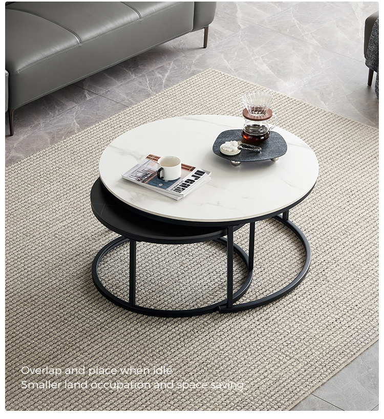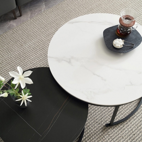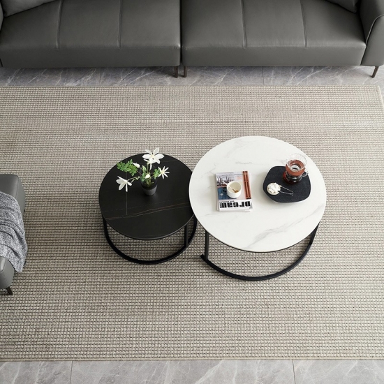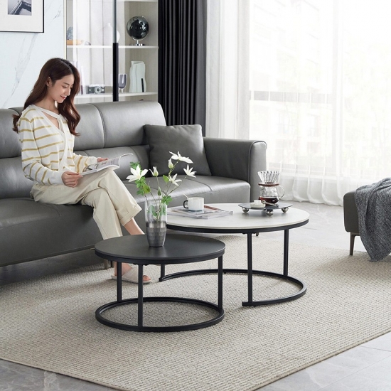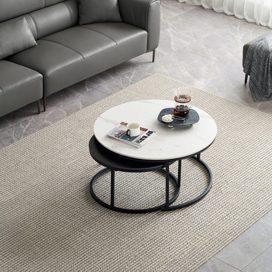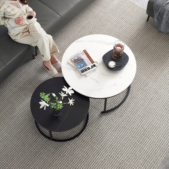 מסתכל על שולחן הקפה החדש בסגנון תעשייתי מבית LINSY. סט 2 חלקים זה של שולחנות קינון כולל בסיס זהב נוצץ וצמרות בהשראת שיש לסגנון שיקי ומתוחכם בסלון שלך. כל שולחן בנוי על מתכת פלדה עגולה פתוחה עם גוון זהב אלגנטי, וניתן בקלות לפרוק אותם או לשמור יחד כדי לחסוך במקום.