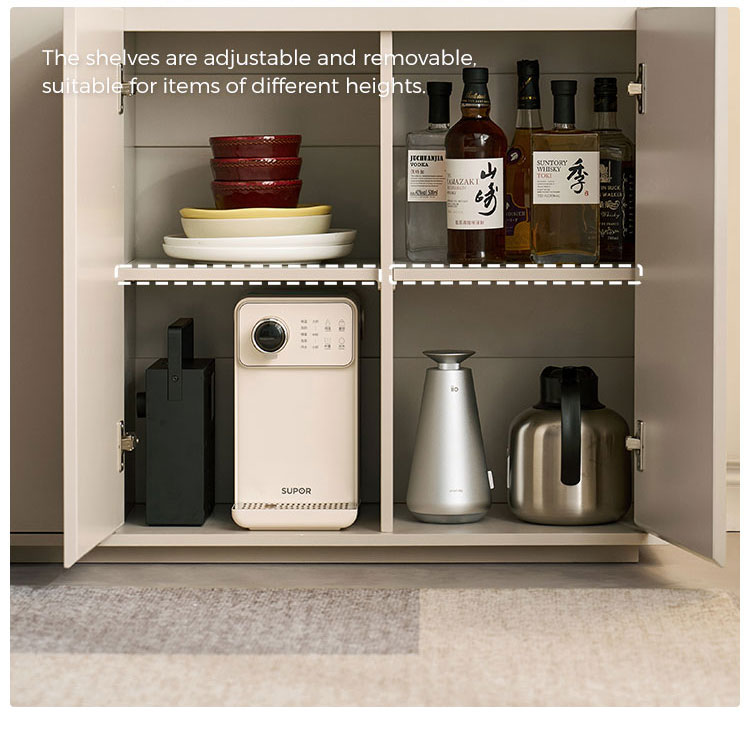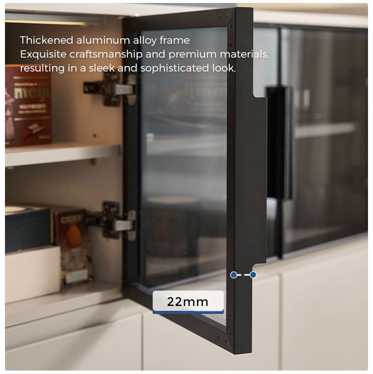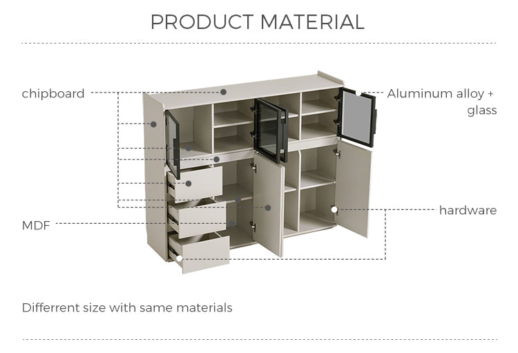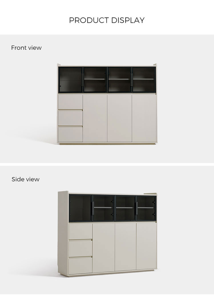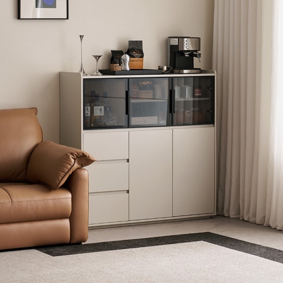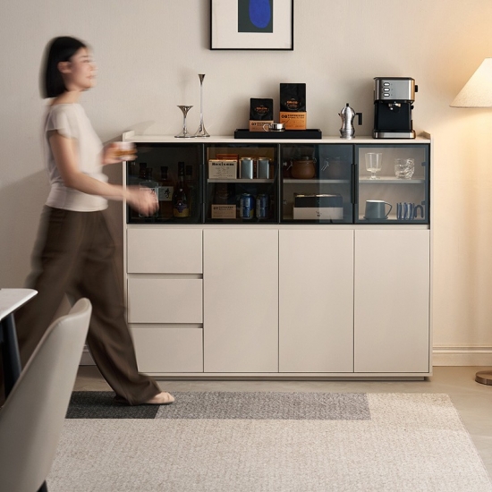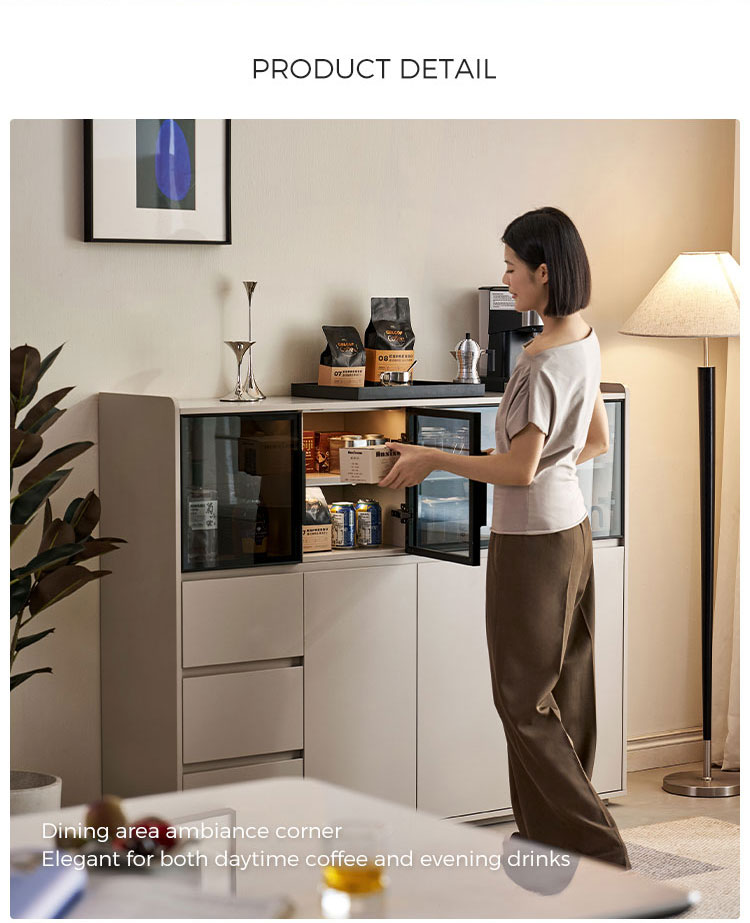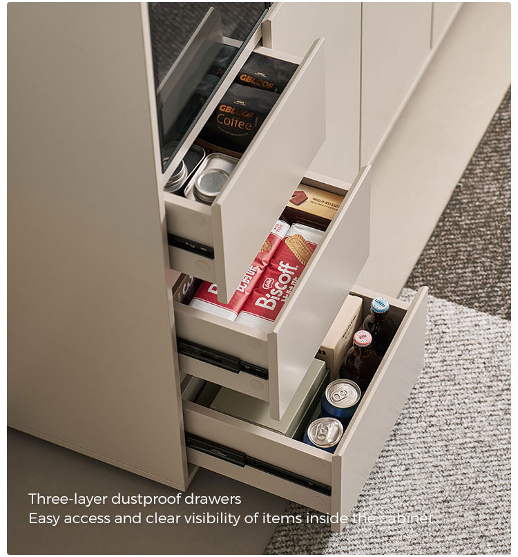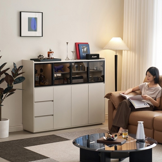 המאפיין הבולט הוא דלתות הזכוכית הגדולות, המאפשרות להציג בצורה אופנתית כלי אוכל, כלי זכוכית או פריטי נוי יקרים, תוך שמירה עליהם נקיים מאבק. זה יוצר תחושה ויזואלית קלילה ופתוחה. משלימים את דלתות הזכוכית מגירות מרווחות מרובות, המספקות אחסון נסתר בשפע ומאורגן היטב. מגירות אלו אידיאליות לאחסון מסודר של סכו"ם, מפות שולחן, פריטי שירות או כל פריט חיוני לסלון, ומבטיחות שלכל דבר יש את מקומו.