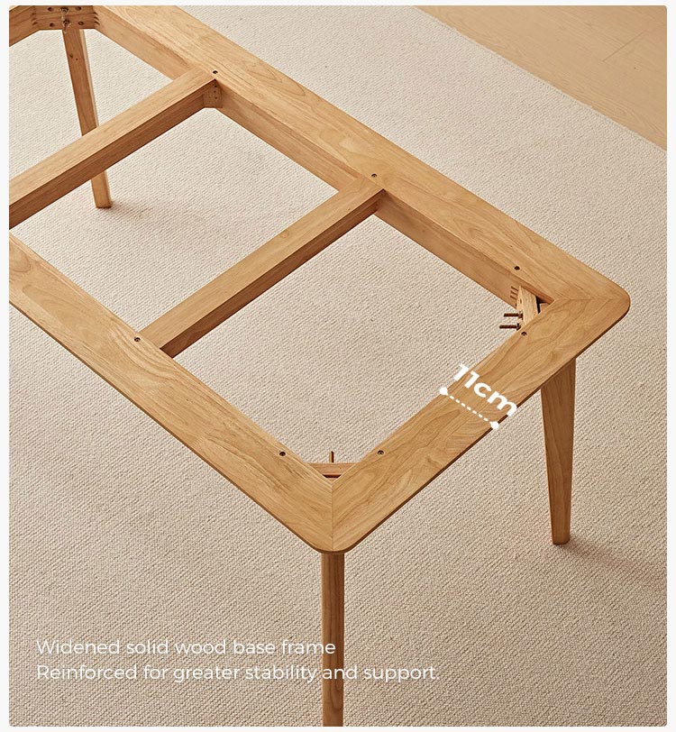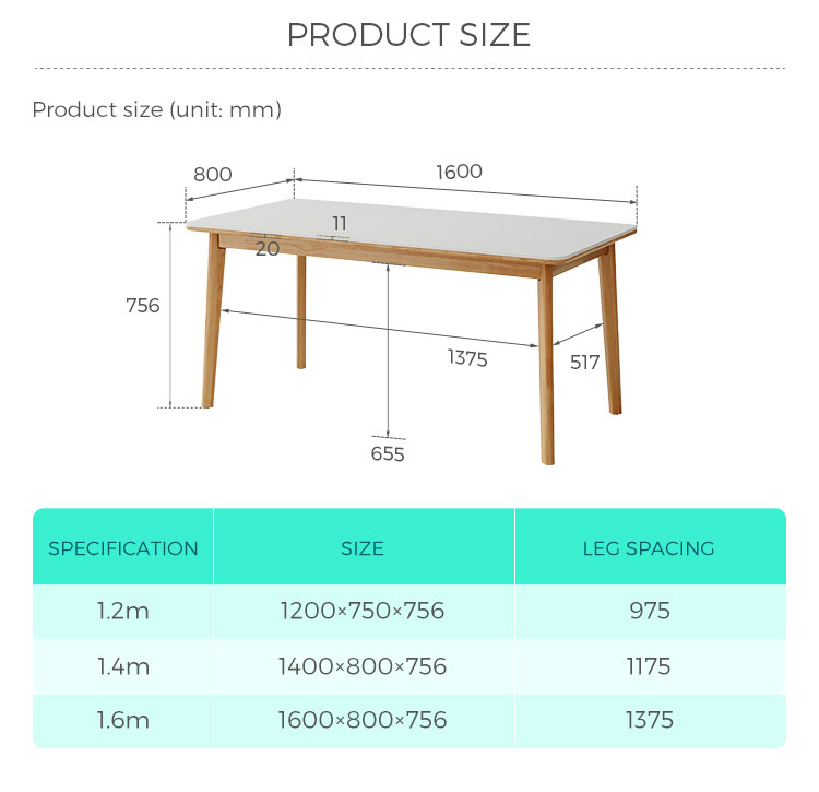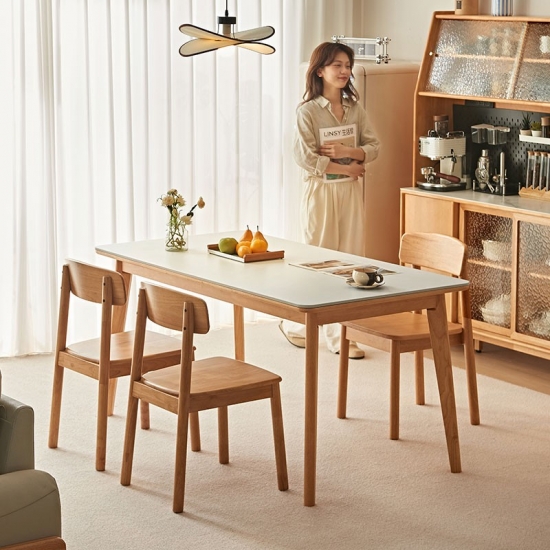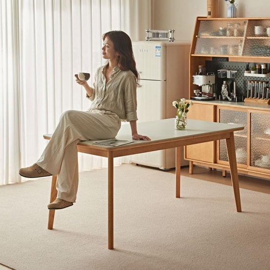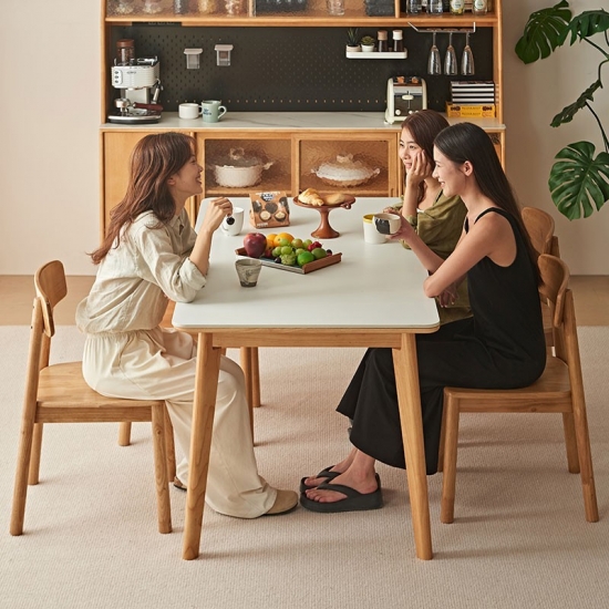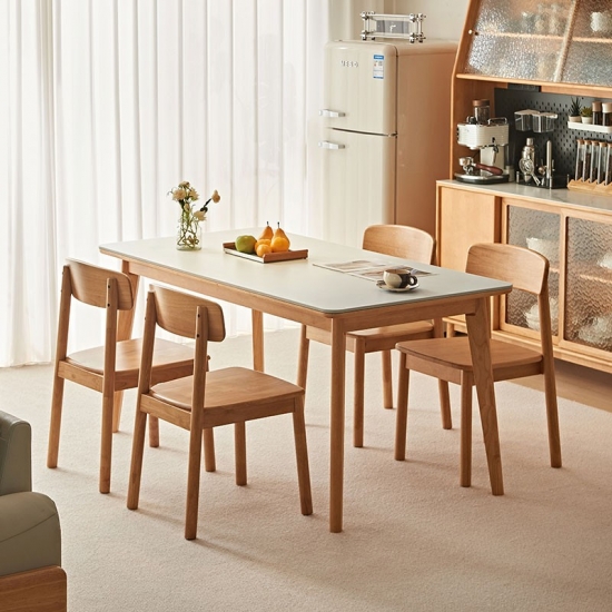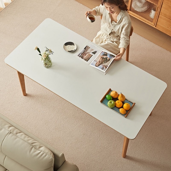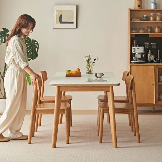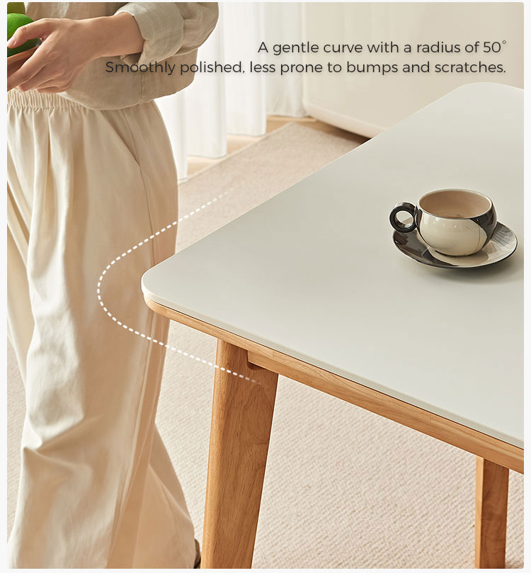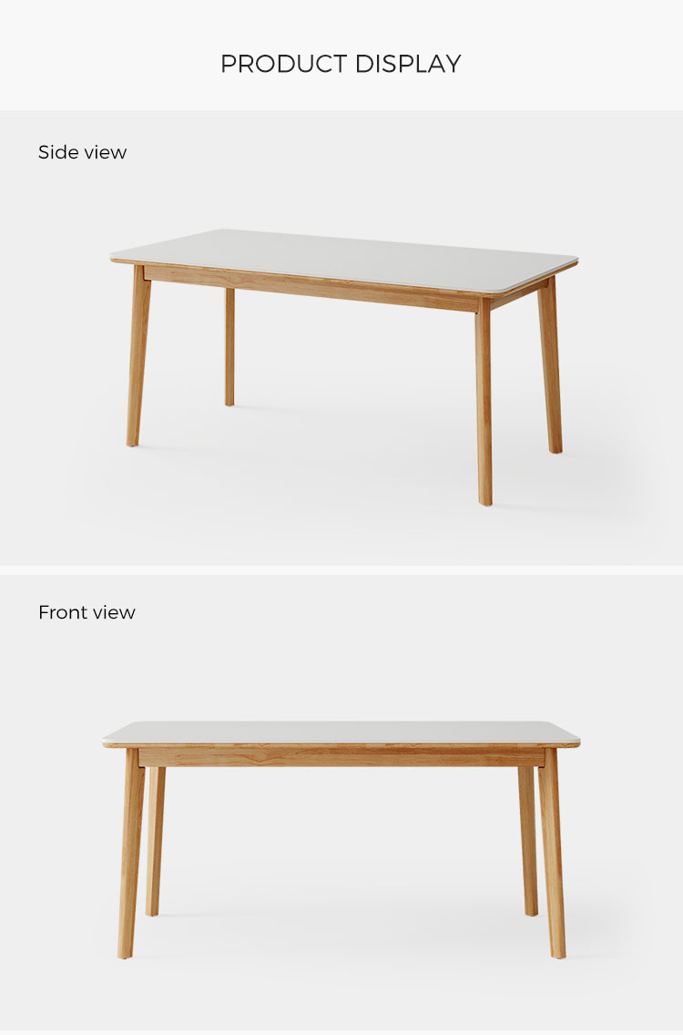 בסיס ורגליים: השולחן תומך על ידי מסגרת מוצקה ואלגנטית פשוטה העשויה מרגלי עץ מלא. הרגליים בדרך כלל מעוצבות בצורה נקייה וחלקה, לרוב בגוון טבעי בהיר או לבן טהור כדי להשלים את משטח השולחן.