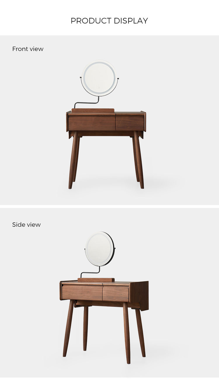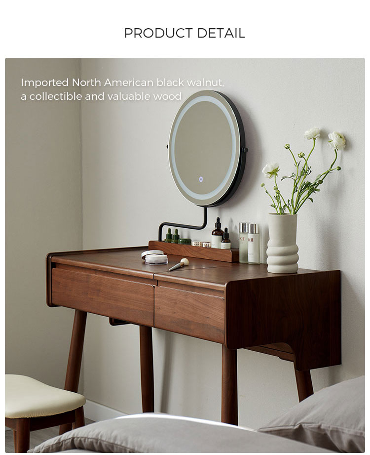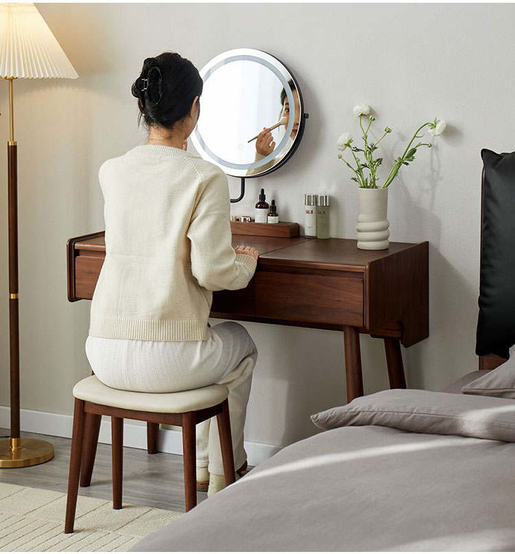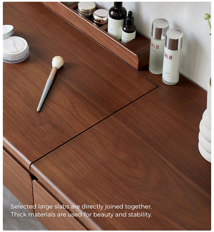 שולחן איפור זה, העשוי מעץ מלא, משדר חמימות ותחכום. פני השטח החלקים והעשירים בגרגירים שלו מציגים את הקסם האורגני של עץ טבעי, וגמורים בלכה מט מגנה או בצבע בגוון דבש כדי לשפר את העמידות והברק.