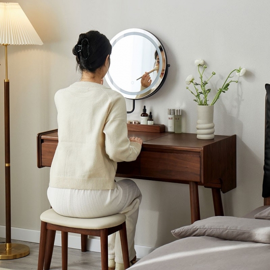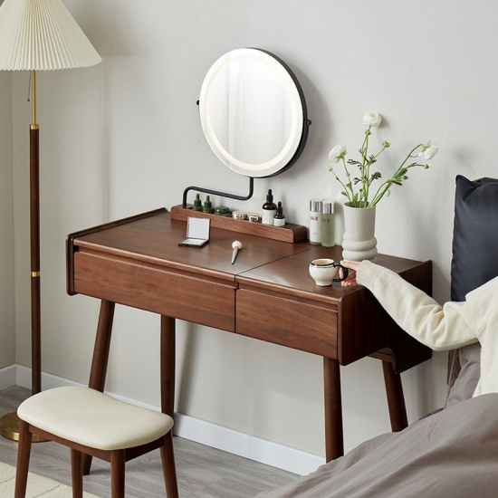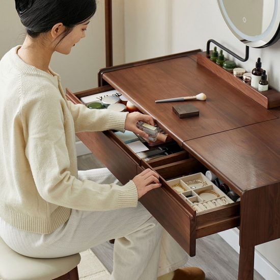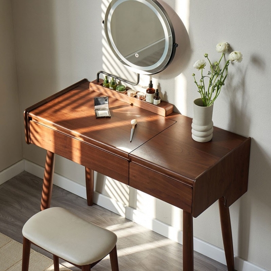 שולחן איפור זה, בגודל 0.8 מטר, מעוצב בגימור אגוז עשיר, משלב אלגנטיות ופרקטיות. שולחן העבודה מציע מרחב גמיש לאיפור, עבודה או לימודים, והופך בקלות לשולחן כתיבה קומפקטי. הוא מעוצב עם אחסון נדיב - כולל מגירות וארגוניות - ושומר על פריטי יופי חיוניים ופריטים יומיומיים מסודרים בצורה מסודרת. המראה המשולבת המתכווננת מבטיחה תאורה ובהירות אופטימליים. אידיאלי לחללי מגורים מודרניים, הוא ממקסם פונקציונליות מבלי להתפשר על סגנון.