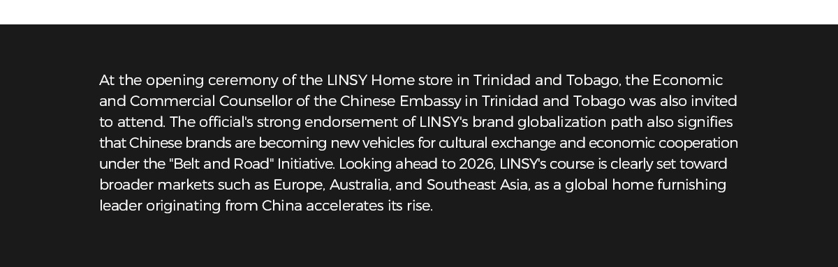 טרינידד וטובגו, עם הכלכלה היציבה והתרבות המגוונת שלה, היו בחירה בעדיפות עליונה עבור LINSY. פתיחת חנות מאפשר ל-LINSY להשתיל את המערכת האקולוגית המלאה שלה — הכולל את ה-DNA של המותג של "אופנה, גיוון ונוחות", פעילות קמעונאית מקיפה ושרשרת אספקה דיגיטלית — חוּץ לָאָרֶץ.