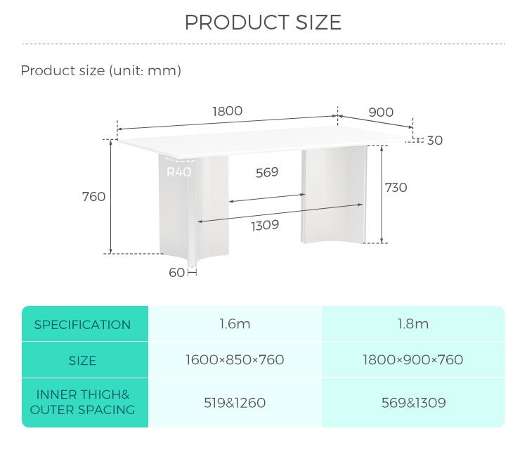 אפשרויות מידות מגוונות: זמין בשני אורכים (1.6 מטר ו-1.8 מטר) כדי להתאים באופן מושלם למרחב ולדרישות הישיבה שלכם (6-8 אנשים).