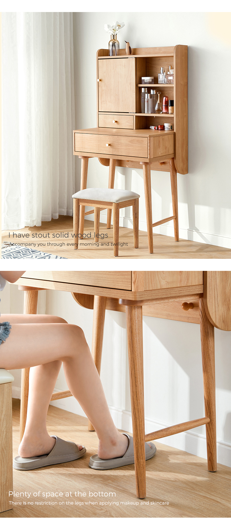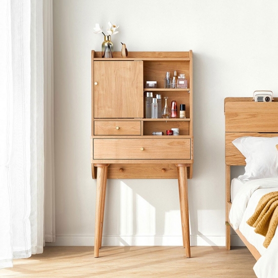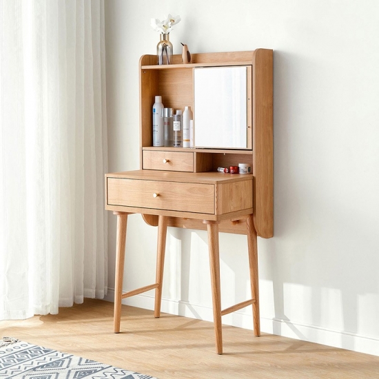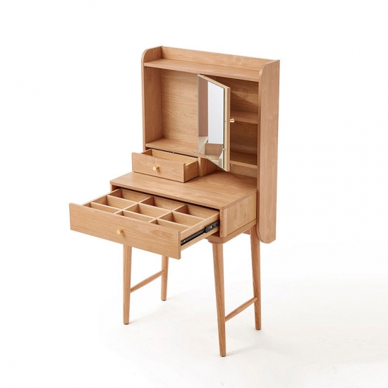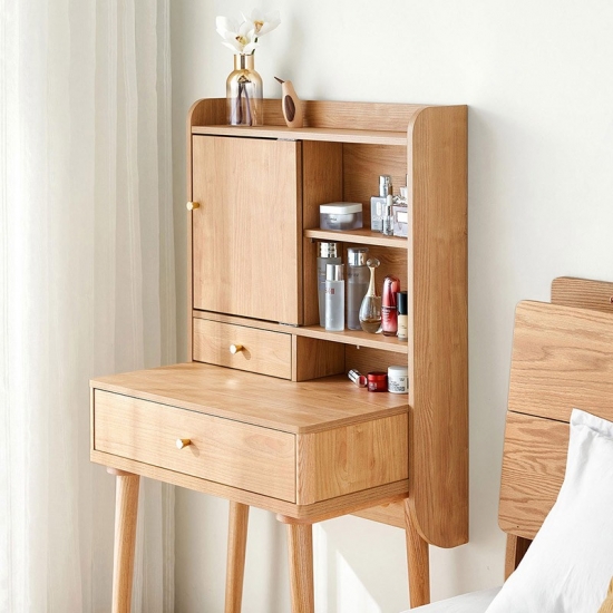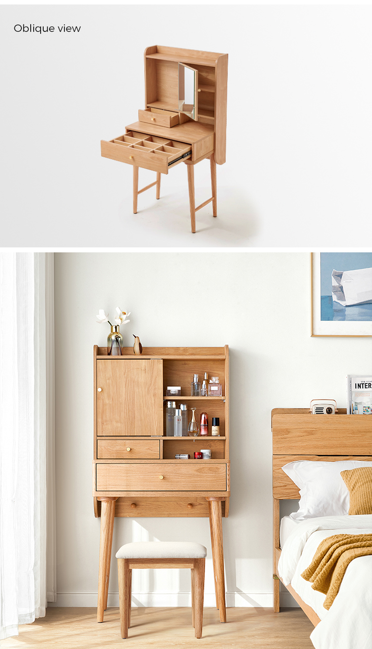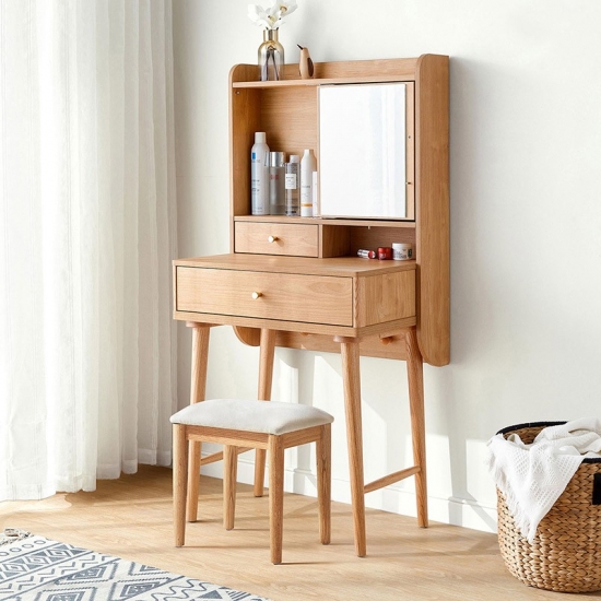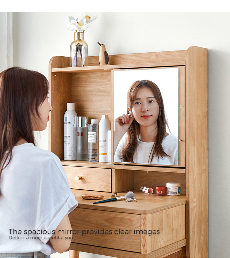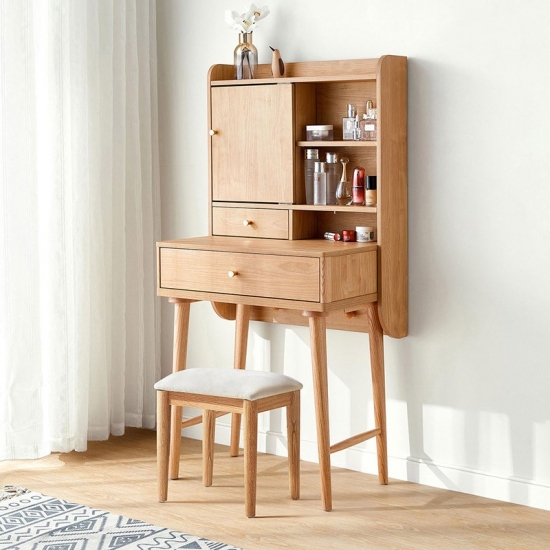 שולחן איפור זה, העשוי מעץ מלא, משדר חמימות ותחכום. פני השטח החלקים והעשירים בגרגירים שלו מציגים את הקסם האורגני של עץ טבעי, וגמורים בלכה מט מגנה או בצבע בגוון דבש כדי לשפר את העמידות והברק.