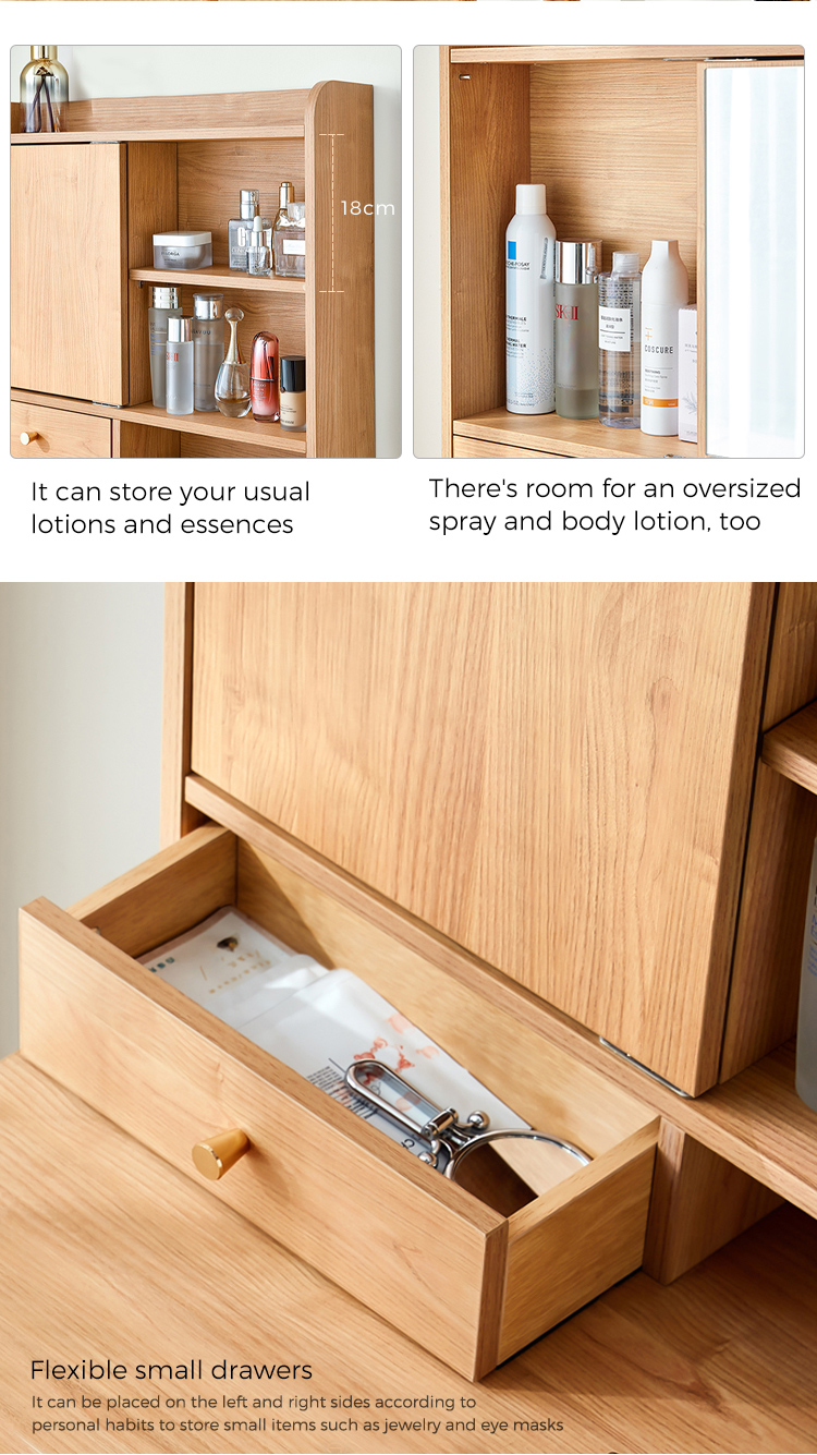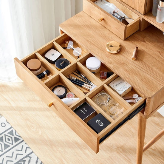 • משטח שולחן מרווח: מקום רב לקוסמטיקה, בשמים ומראה.