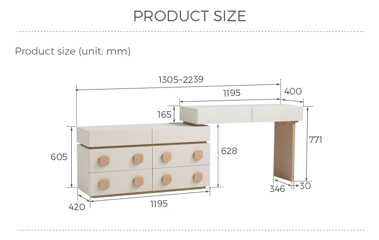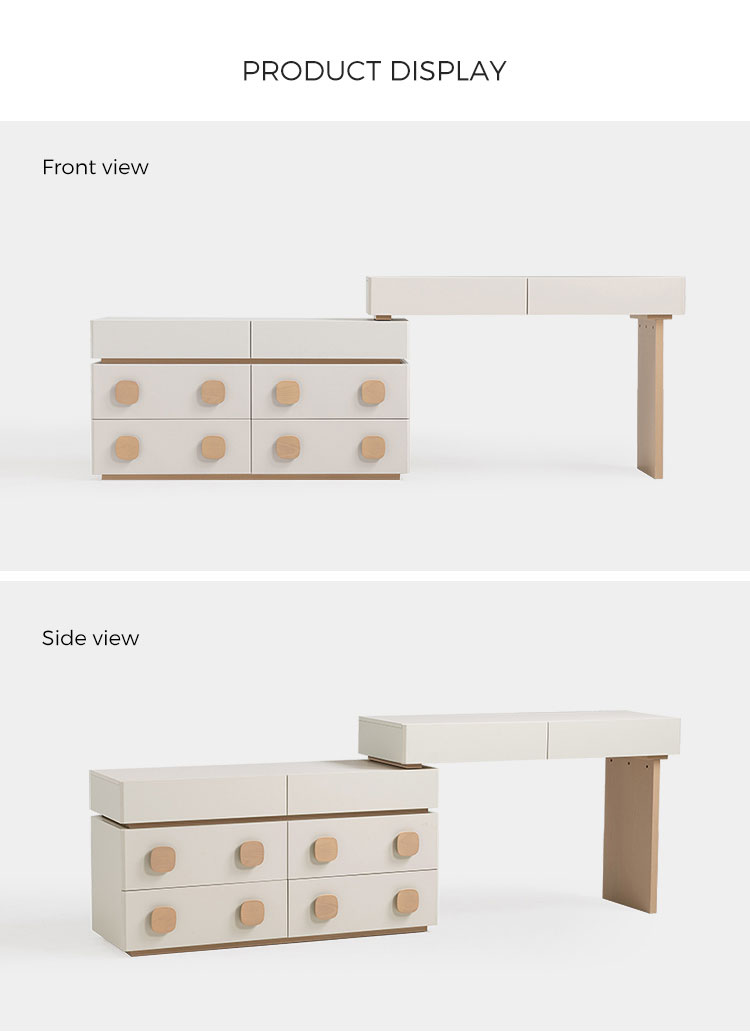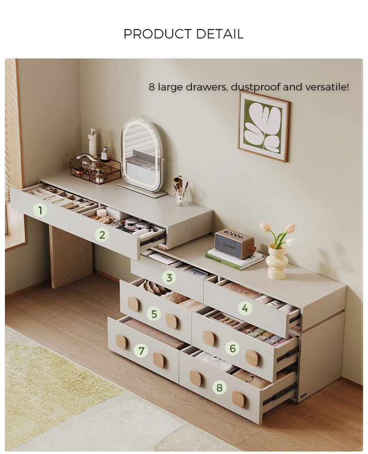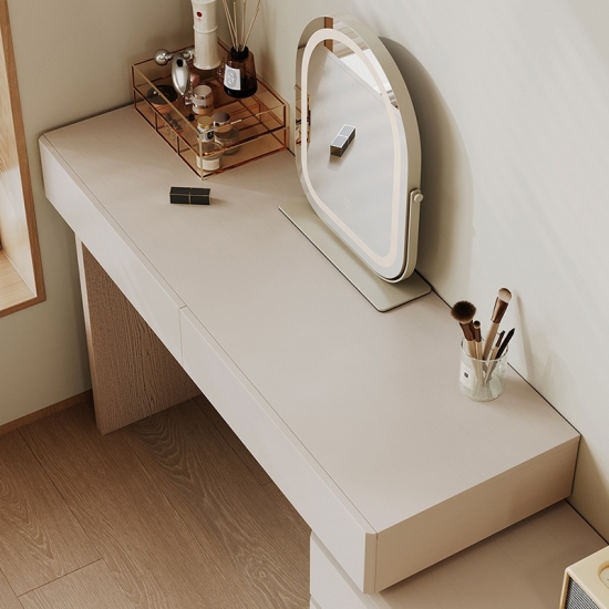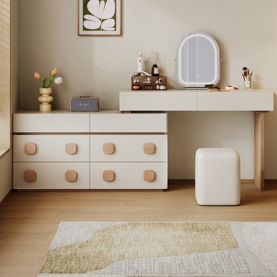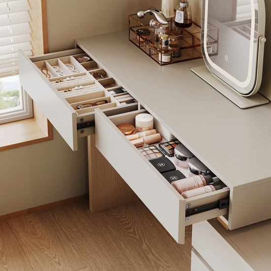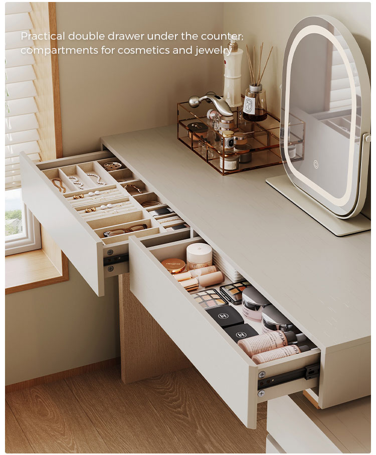 עיצוב הרמוני: שידת איפור זו, המעוצבת בקווים נקיים וגימורים איכותיים, משדרת אלגנטיות נצחית. העיצוב הקוהרנטי מבטיח שהמראה, המגירות והמסגרת ישתלבו יחד כדי ליצור נקודת מוקד של יוקרה מעודנת.
