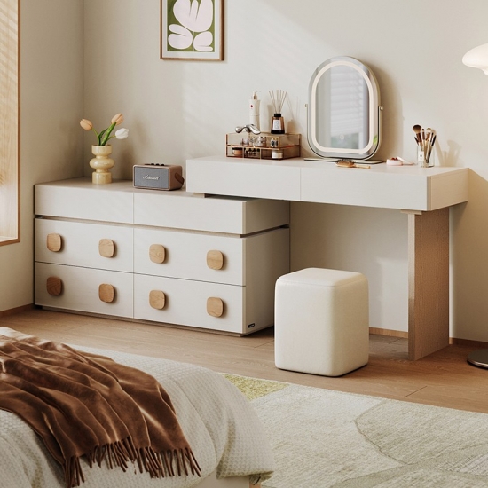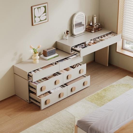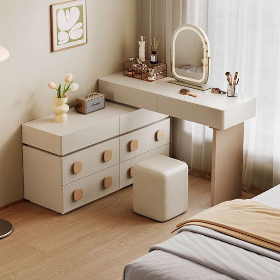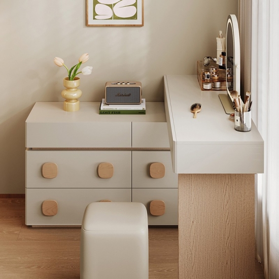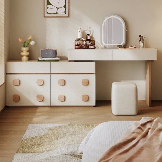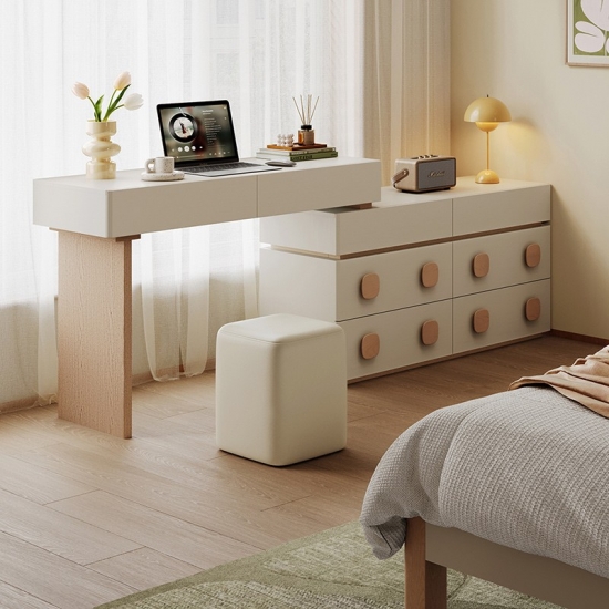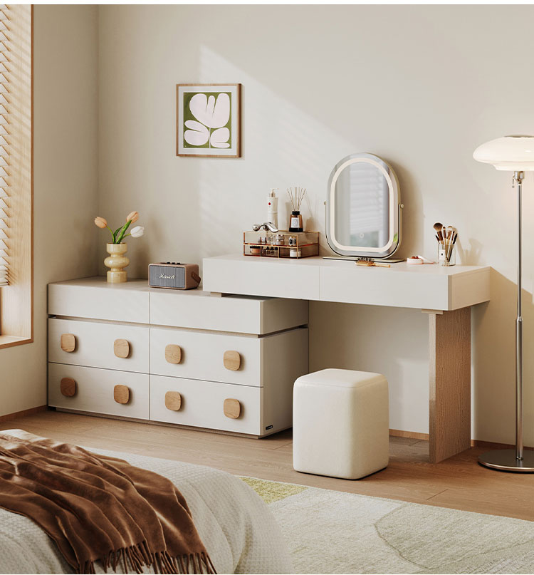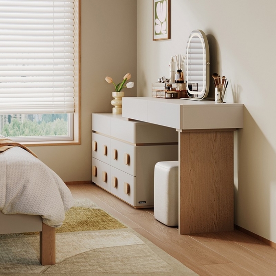 פתרון לחיסכון במקום: שילוב שידה, שולחן איפור ומראה לפריט אחד מאוחד ממקסם את הפונקציונליות תוך אופטימיזציה של תוכנית הרצפה של חדר השינה.