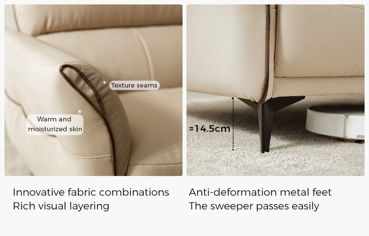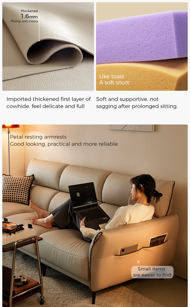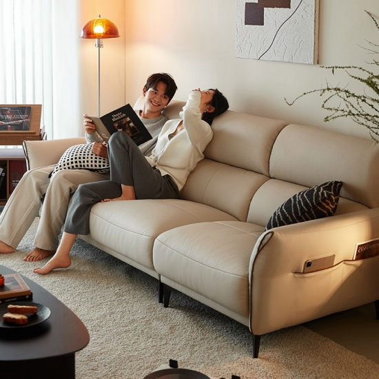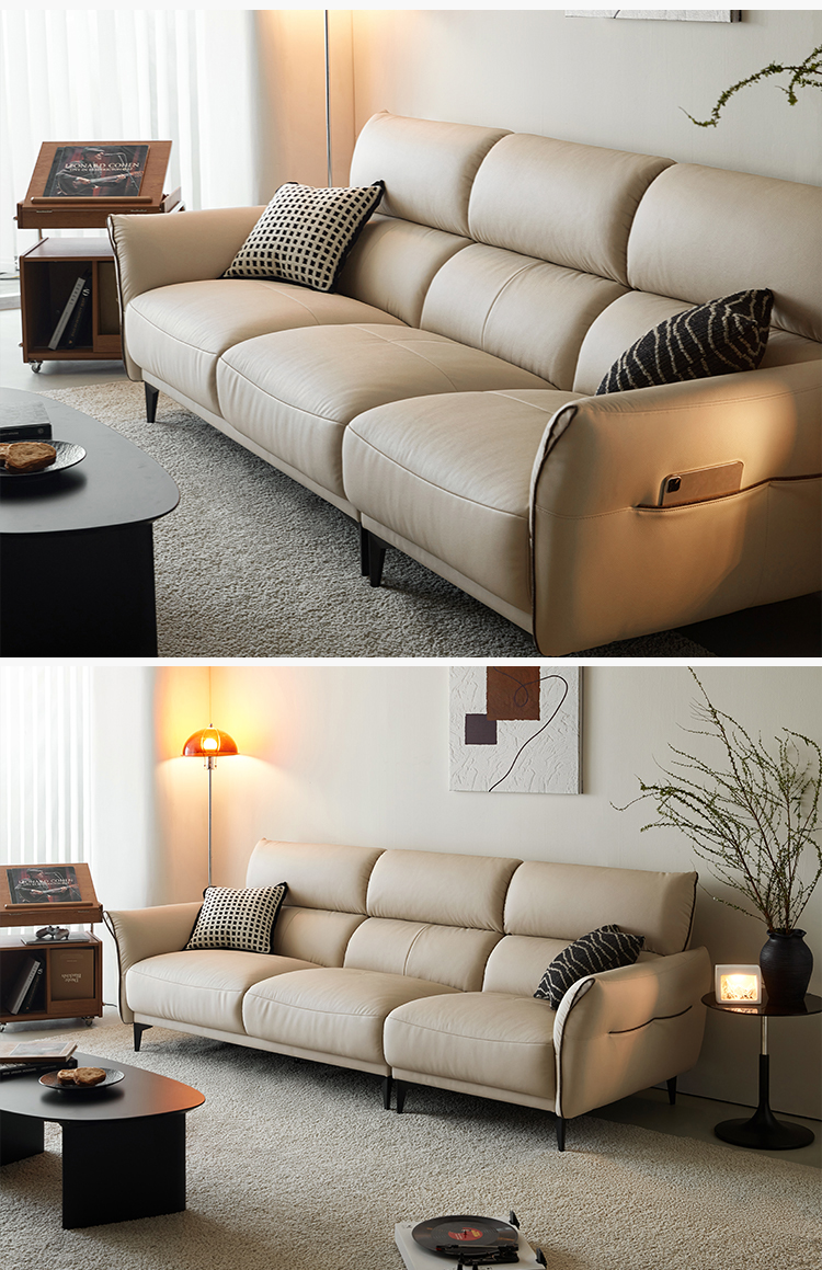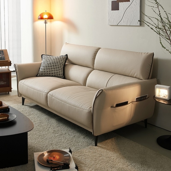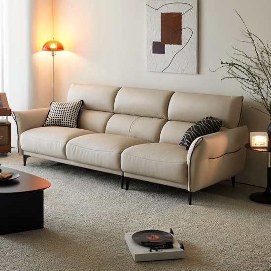 ספת עור רכה זו, בגוון עדין של חול, מעוצבת הן למען סגנון והן למען רגיעה, משתלבת בצורה חלקה בעיצוב פנים מודרני וקלאסי. המרקם הקטיפתי המזמין מציע מגע יוקרתי, בעוד שהעיצוב הארגונומי מבטיח נוחות יוצאת דופן.